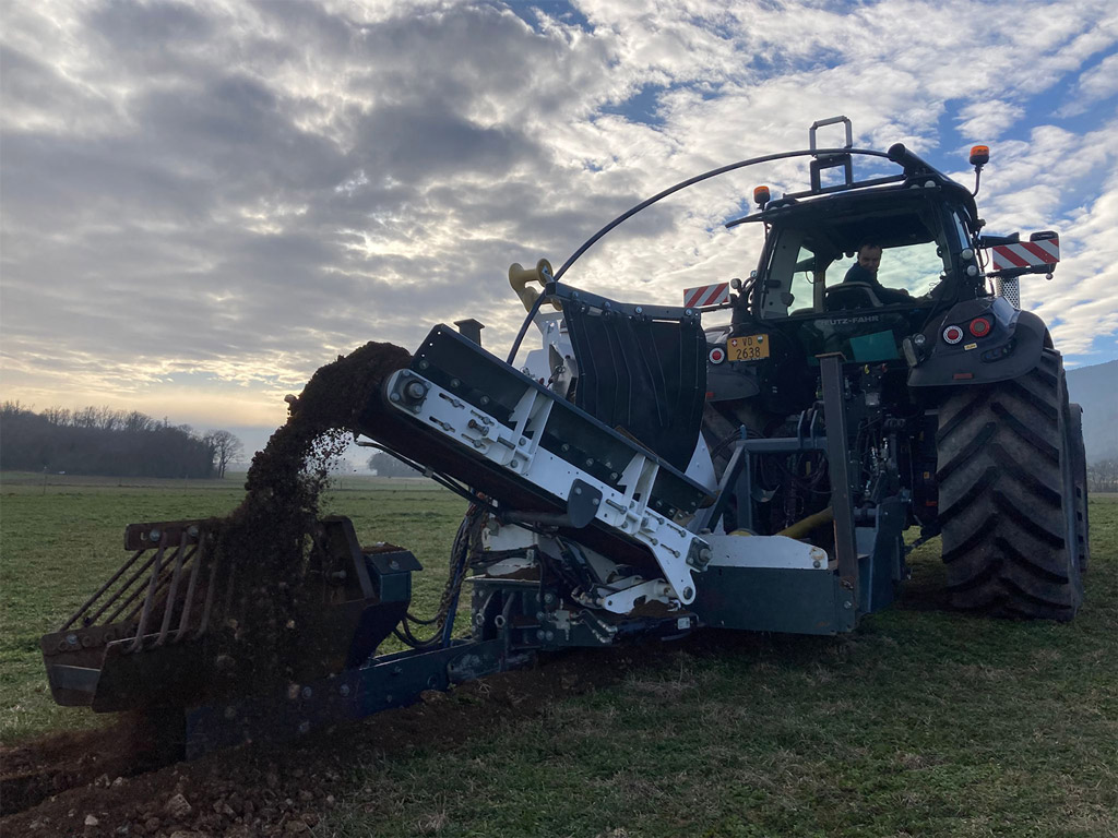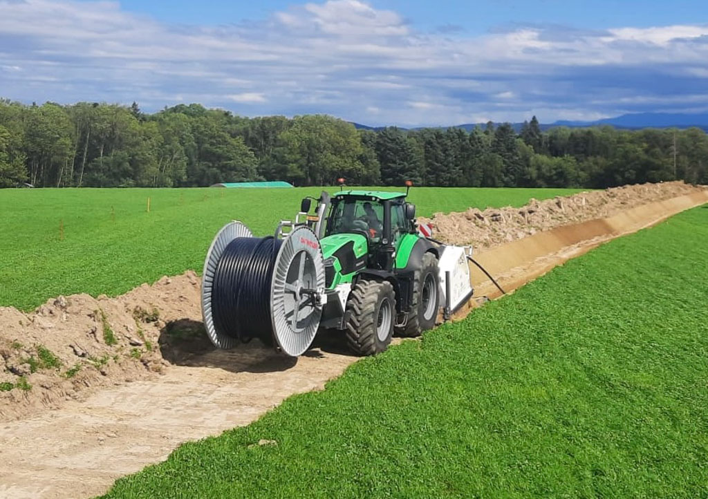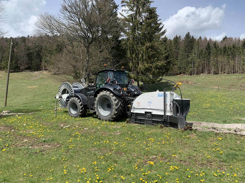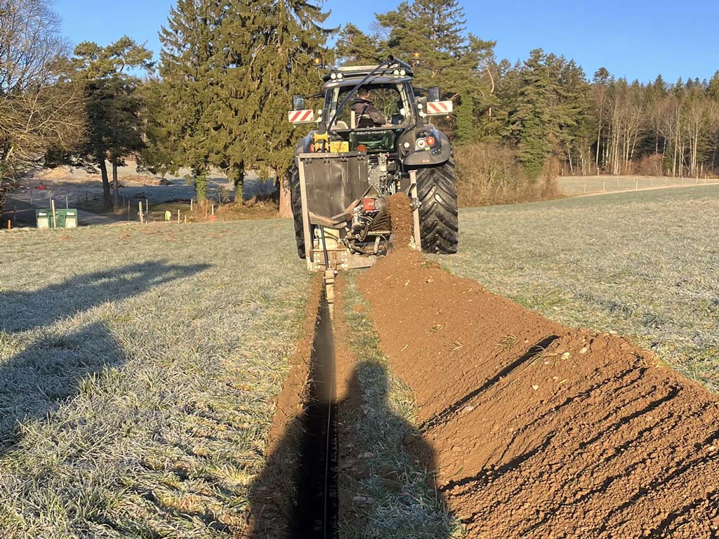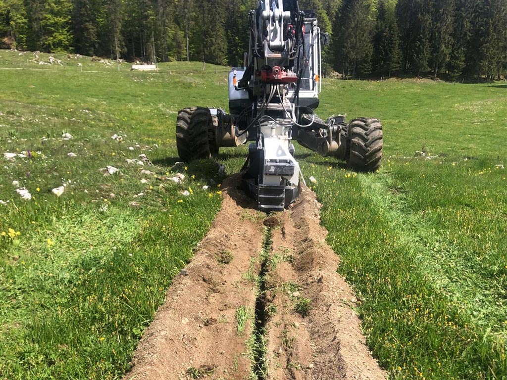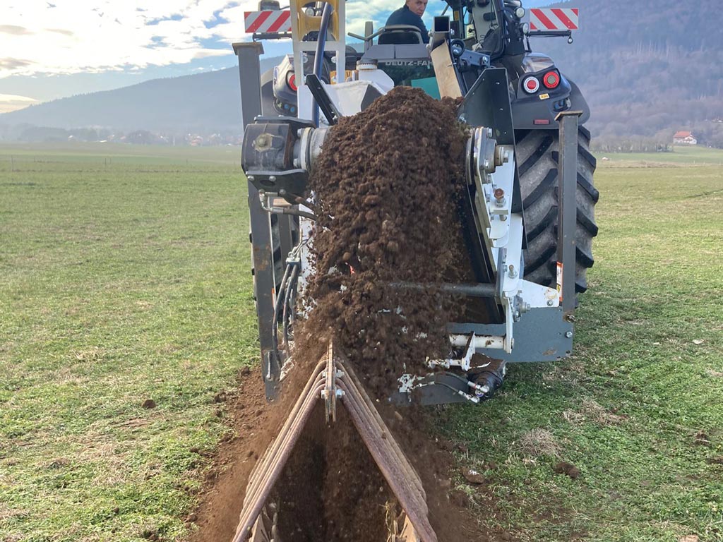 Cette trancheuse est idéale pour la pose de tuyaux d’eau d’un diamètre allant jusqu’à 63mm, directement déroulés dans la fouille. Elle permet de remblayer le tuyau avec les matériaux extraits, passés au crible afin qu’il n’y ait pas de gros cailloux autour du tuyau. Nous avons aussi un nouveau système de remblayage défiant toute concurrence.