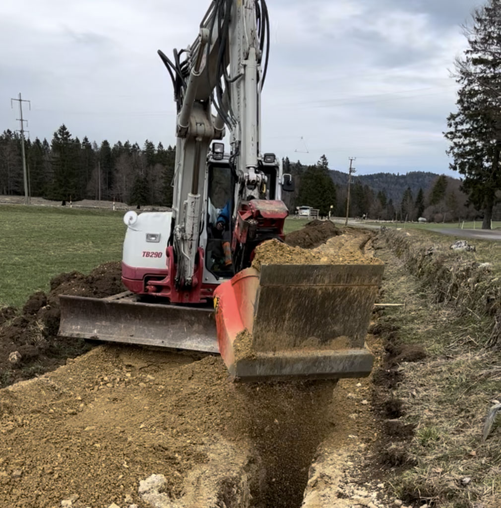 Cette trancheuse nous permet d’ouvrir des fouilles jusqu’à 35 cm de large. Elle est aussi l’outil idéal pour les fouilles dans des terrains rocheux (calcaire). Grâce à notre godet cribleur, nous sommes en mesure de valoriser les matériaux extraits et ainsi de diminuer voir de supprimer l’apport de sable lors du remblayage.